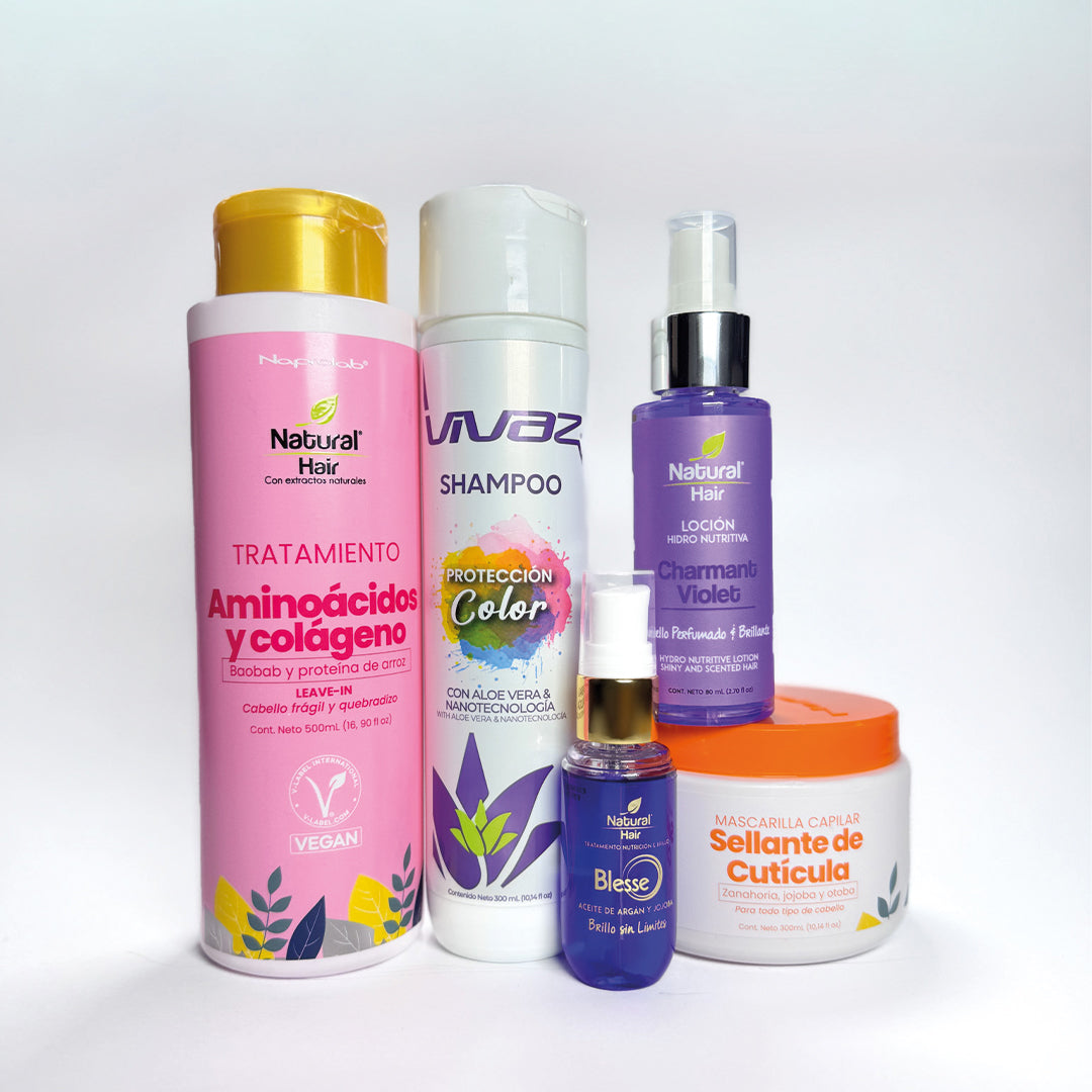 Preserva la intensidad de tu tono con nuestro Kit de Protección Color, diseñado especialmente para prolongar la vitalidad del tinte mientras nutre profundamente. Este tratamiento avanzado hidrata la fibra capilar, evitando el desgaste y la oxidación del color.